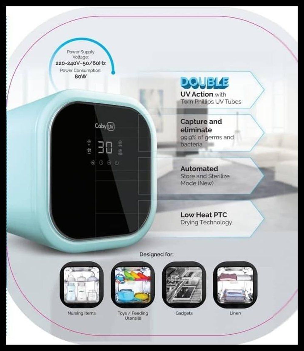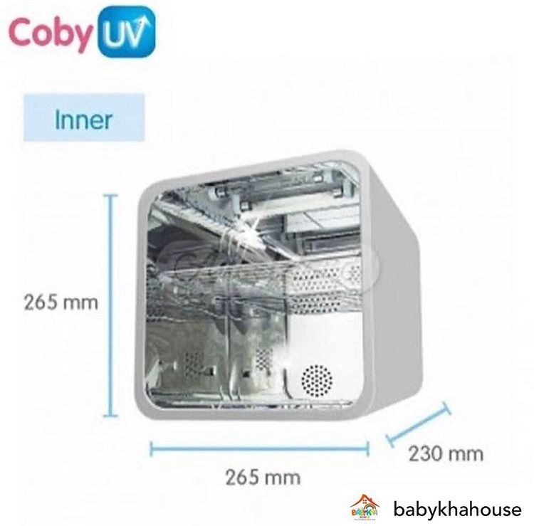 botol bayi, piring/ botol plastik, handphone, gadget, mainan, make up brush dan pompa asi. Sterilisasikan botol dan pompa asi dengan menekan satu tombol dan dapat ditinggal tidur. Coby UV menggunakan PTC Blower, yang merupakan system pengeringan yang baru, dibandingkan dengan system pengeringan lama. Coby UV dilengkapi timer dan sangat simple sehingga mudah digunakan.