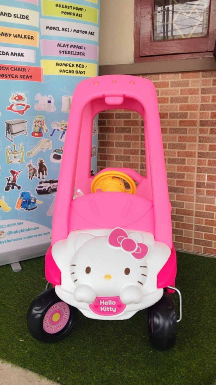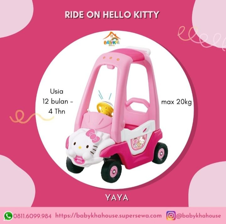 Mainan mobil bertema Hello Kitty ini bisa digunakan oleh anak mulai usia 7/8bulan sampai dengan 5tahun. Dengan berat maksimal anak 22kg. Terdapat stri mobil yang mengeluarkan bunyi suara2 dan bisa digerakkan.